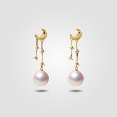 Ethereal and celestial, the Lunara Earrings draw inspiration from the quiet magic of a moonlit night. A gleaming freshwater pearl floats beneath golden crescent moons, their delicate paths traced by diamond stars. With every subtle sway, they shimmer like constellations in motion — a graceful tribute to lunar beauty and cosmic elegance.