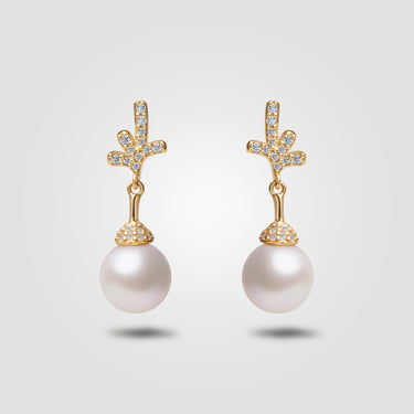 Ethereal and refined, the Faylure Earrings evoke the delicate charm of a fairy's whisper. Each earring features a luminous freshwater pearl, gracefully suspended beneath gold-tipped, diamond-encrusted branches that glisten like morning dew. The design captures both softness and sparkle — a poetic balance of nature’s elegance and timeless craftsmanship.