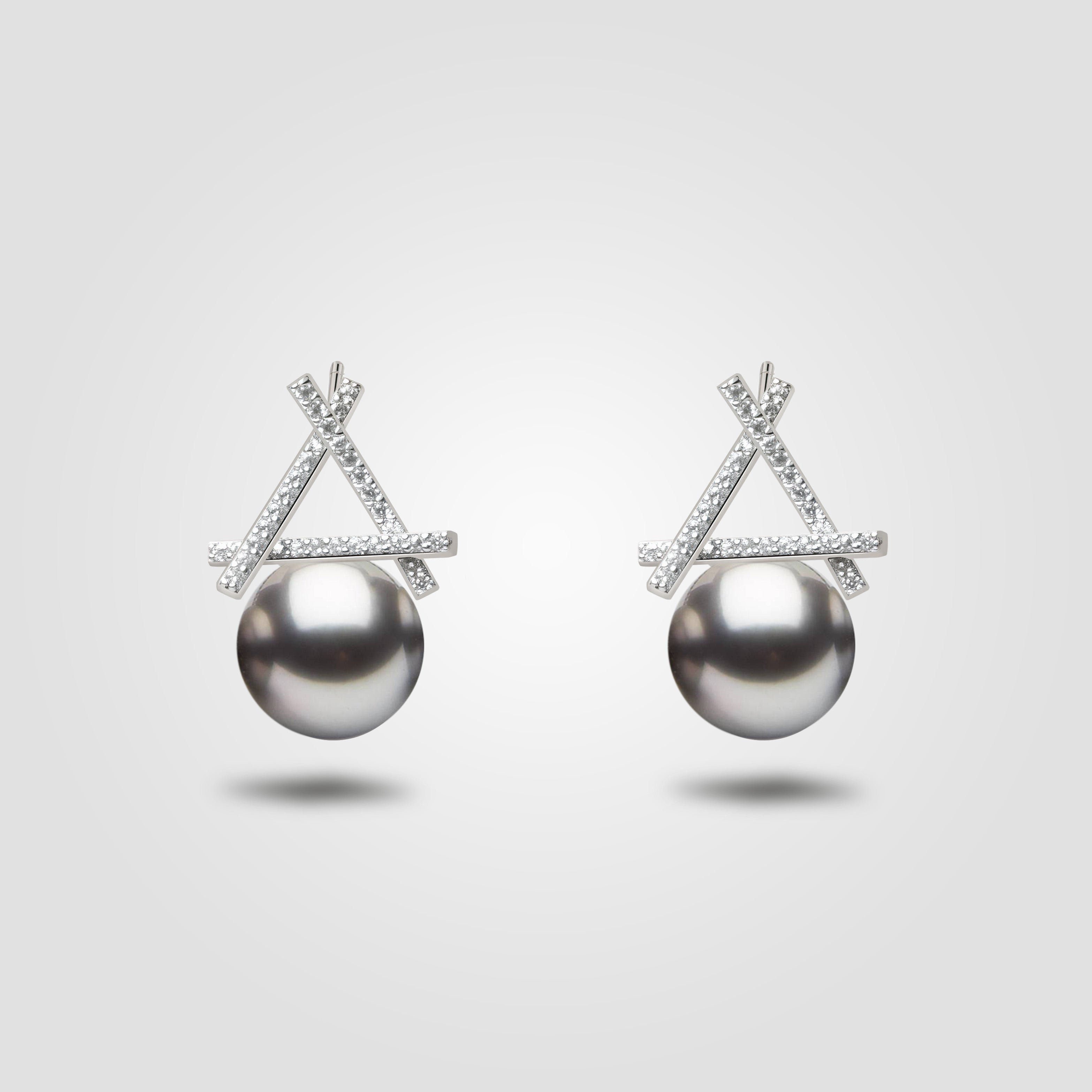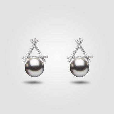 These timeless drop earrings feature lustrous Tahitian pearls, known for their natural dark hues and iridescent overtones. Each pearl is gracefully dangles beneath a geometric diamond setting, creating a striking contrast between soft organic beauty and sharp modern lines.
