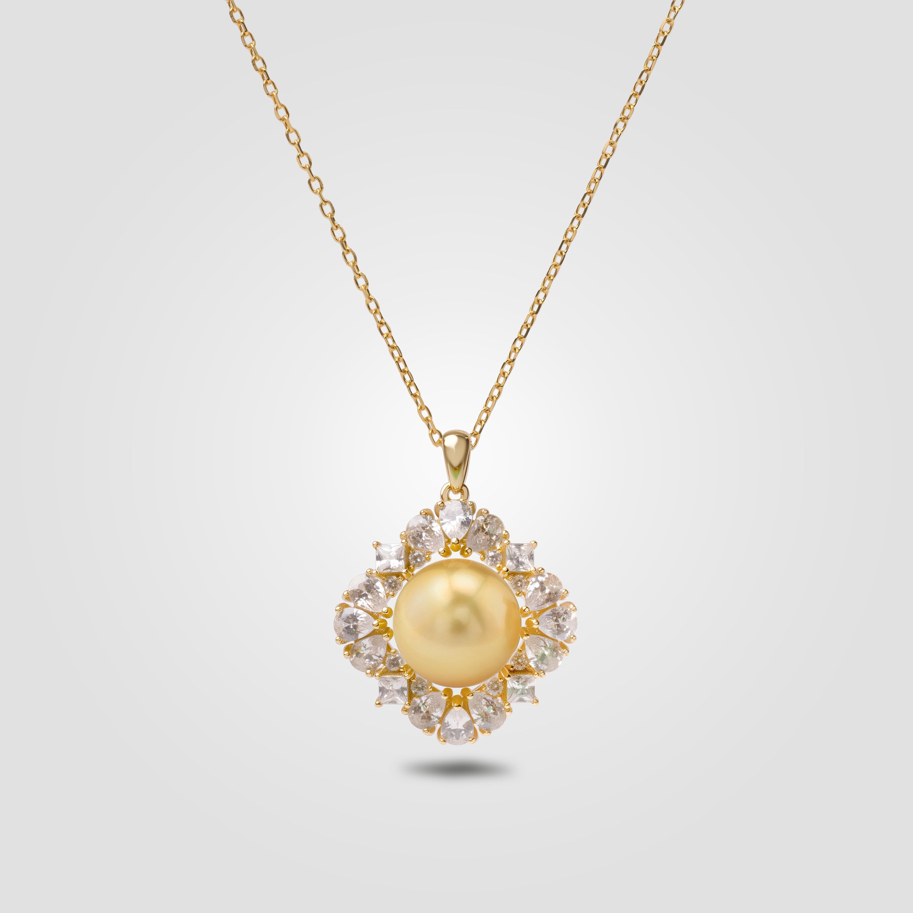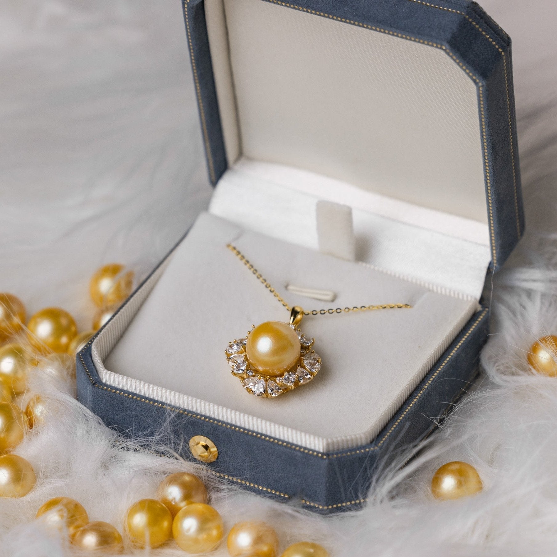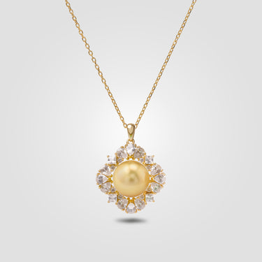 Radiant and regal, the Solara Pendant captures the brilliance of the sun in full bloom. At its heart rests a rare Golden South Sea pearl, surrounded by a crown of meticulously cut diamonds arranged in a floral sunburst motif. The harmonious blend of warm golden luster and scintillating light creates a piece that is both commanding and graceful — a celebration of elegance and inner strength.