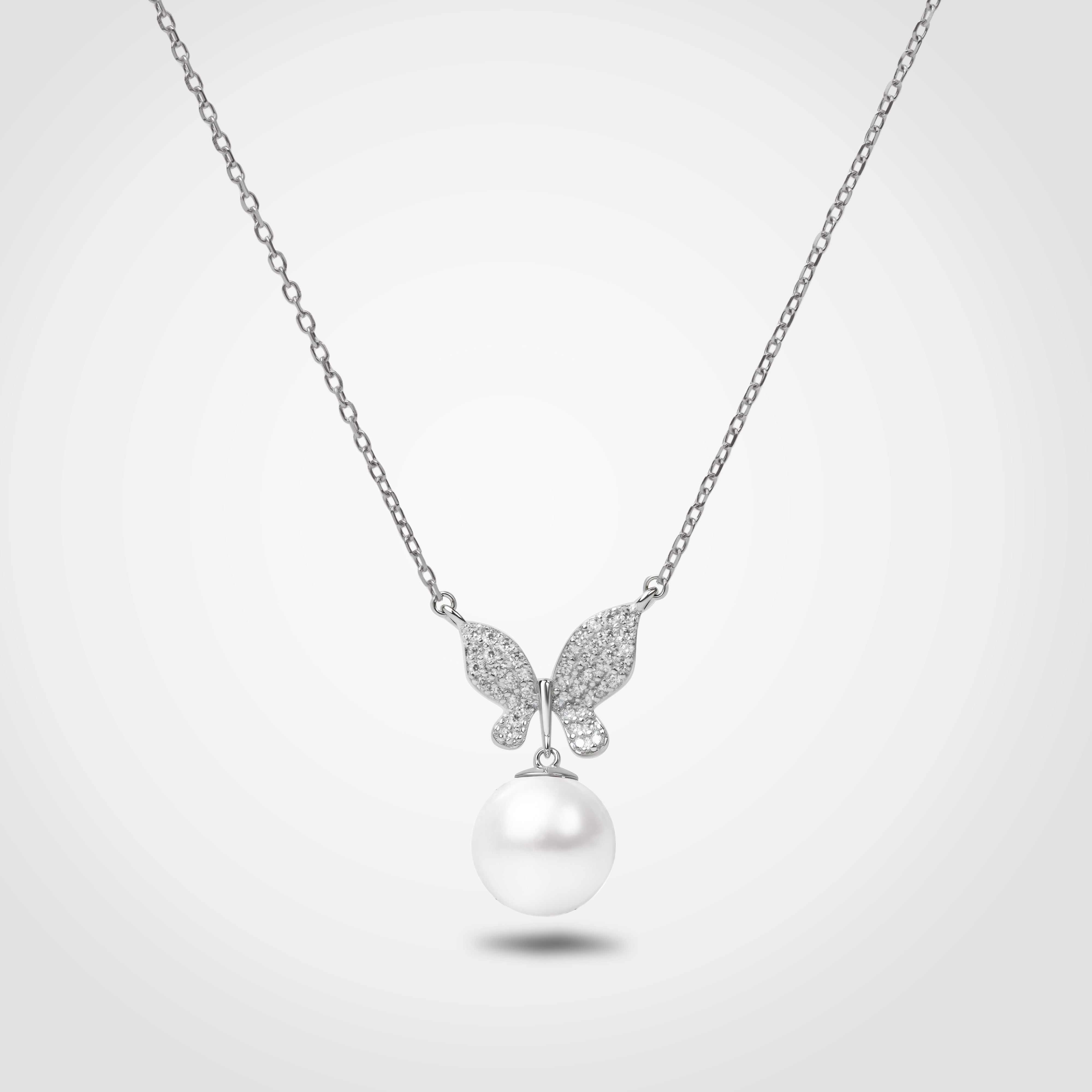 Grace takes flight in this ethereal pendant, where a luminous white freshwater pearl delicately descends from a pavé-set butterfly. Each wing shimmers with intricately placed stones, capturing the fleeting beauty of transformation and light. Perfectly poised between nature’s elegance and refined luxury, this piece evokes a sense of timeless enchantment and feminine grace.