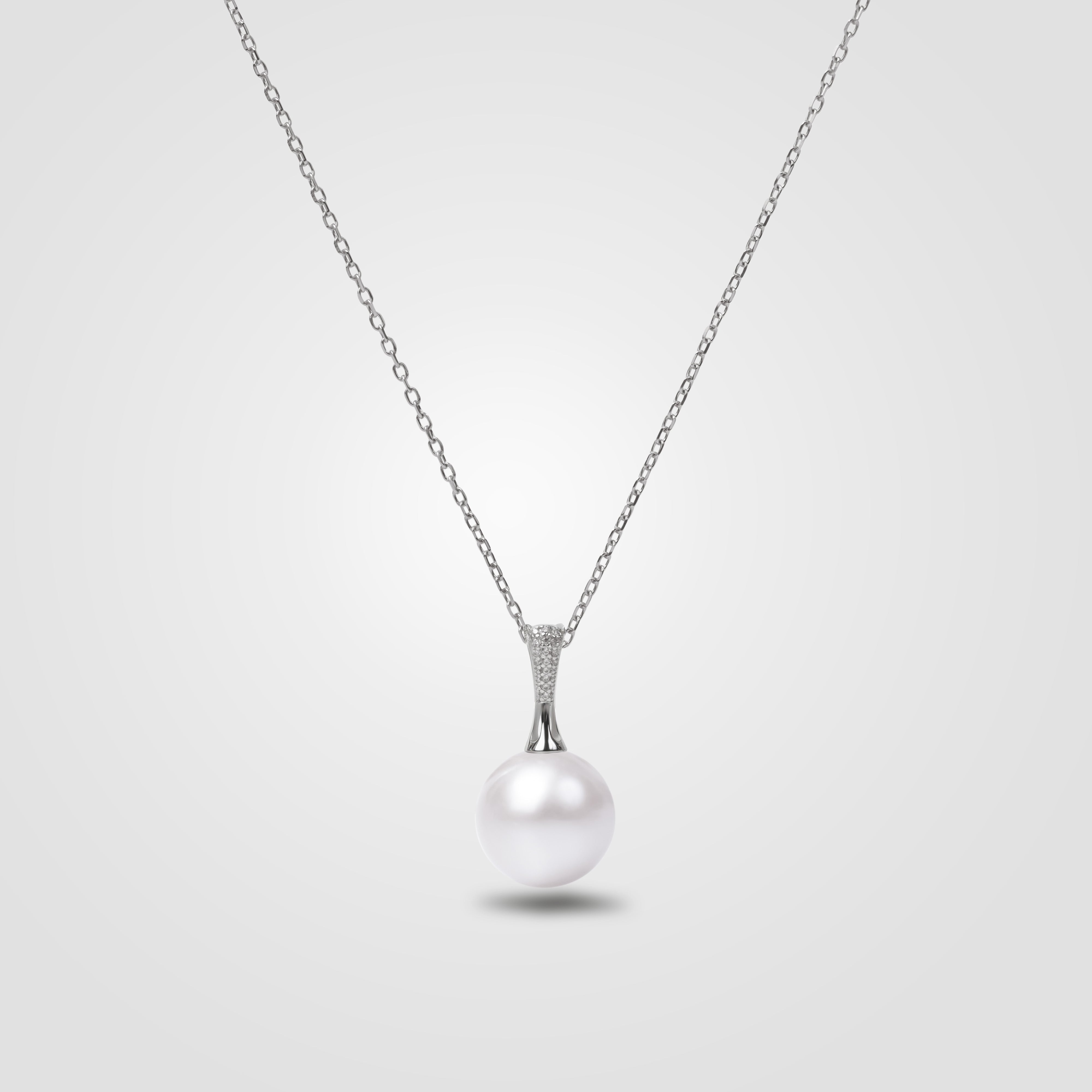 A refined symbol of elegance, this pendant features a radiant white freshwater pearl gracefully set in sterling silver. The pavé-set diamond bail adds a subtle shimmer, beautifully complementing the pearl’s soft luster.