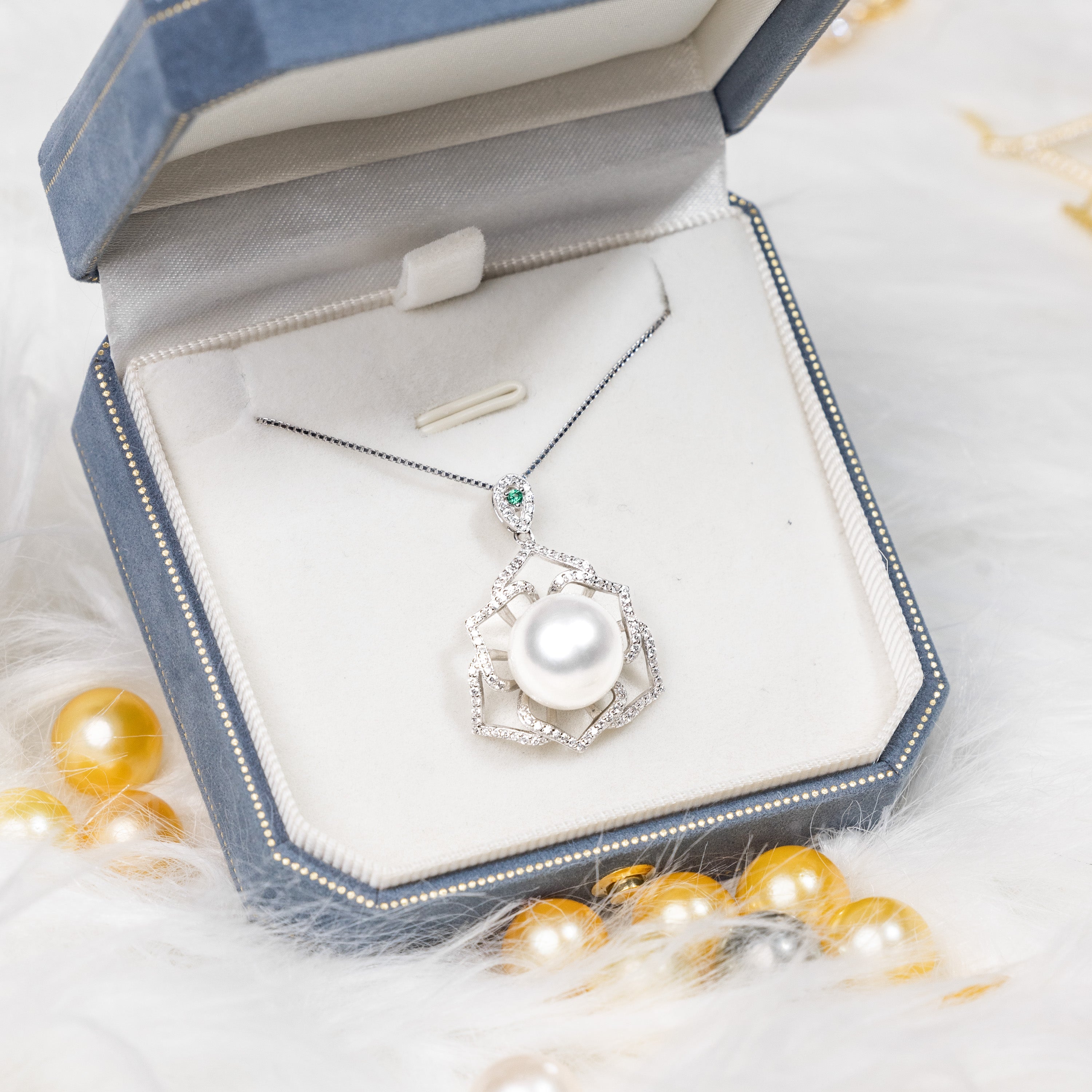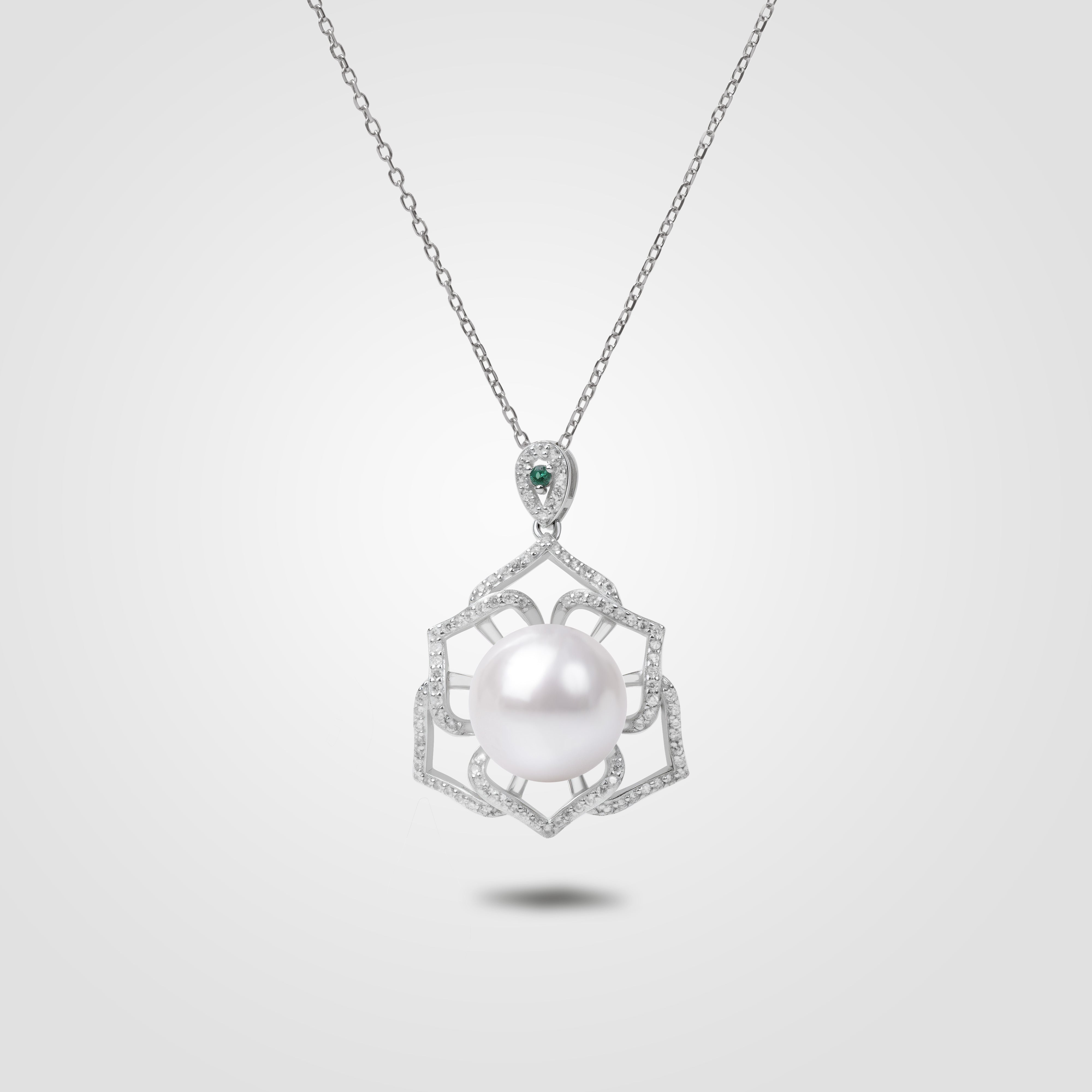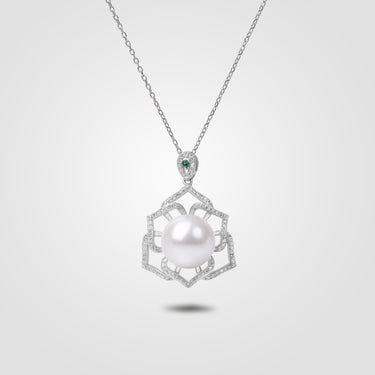 Ethereal and refined, the Lotara Pendant draws inspiration from sacred geometry and celestial purity. A luminous White South Sea pearl is cradled within a star-like diamond-encrusted frame, delicately sculpted in a lotus-inspired silhouette. A single green gemstone sparkles at the top, adding a touch of vitality and contrast to the serene composition.
