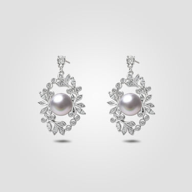 These exquisite earrings feature two 8.0mm Japanese Akoya pearls, carefully selected for their exceptional luster and soft, glowing overtones. Each pearl is gracefully framed by intricate, leaf-inspired detailing set with sparkling diamonds, forming a delicate wreath-like silhouette. The cool silver tones and organic curves blend timeless elegance with a touch of natural charm—perfect for both everyday sophistication and special occasions.