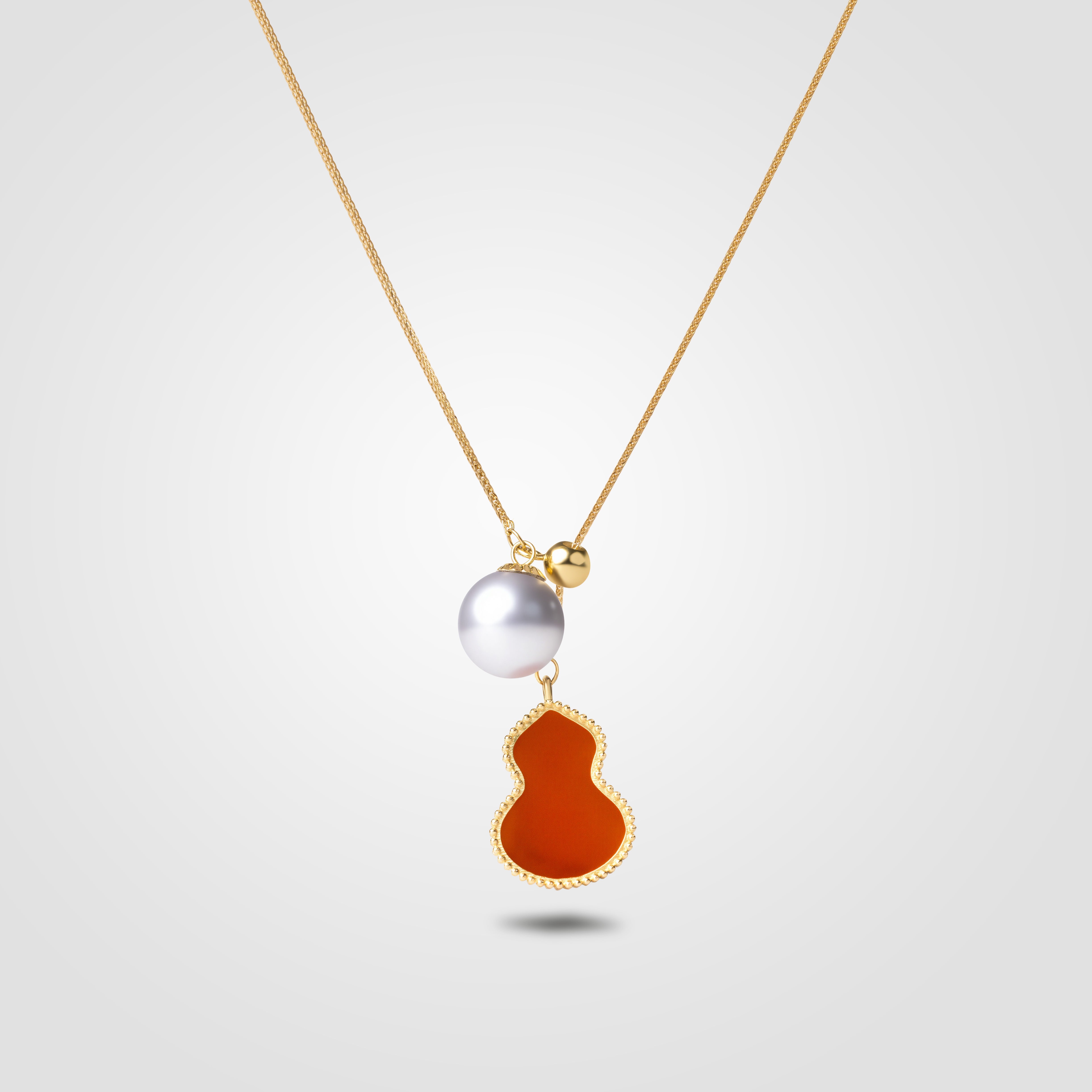 Graceful and auspicious, the Zorana Pendant blends timeless Eastern symbolism with modern elegance. A luminous Akoya pearl (6.0mm–8.0mm) radiates soft iridescence, paired with a delicately crafted gourd-shaped charm of warm carnelian framed in golden beading. In many cultures, the gourd signifies prosperity, good health, and protection — making this piece not just a necklace, but a cherished talisman.