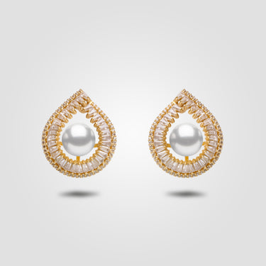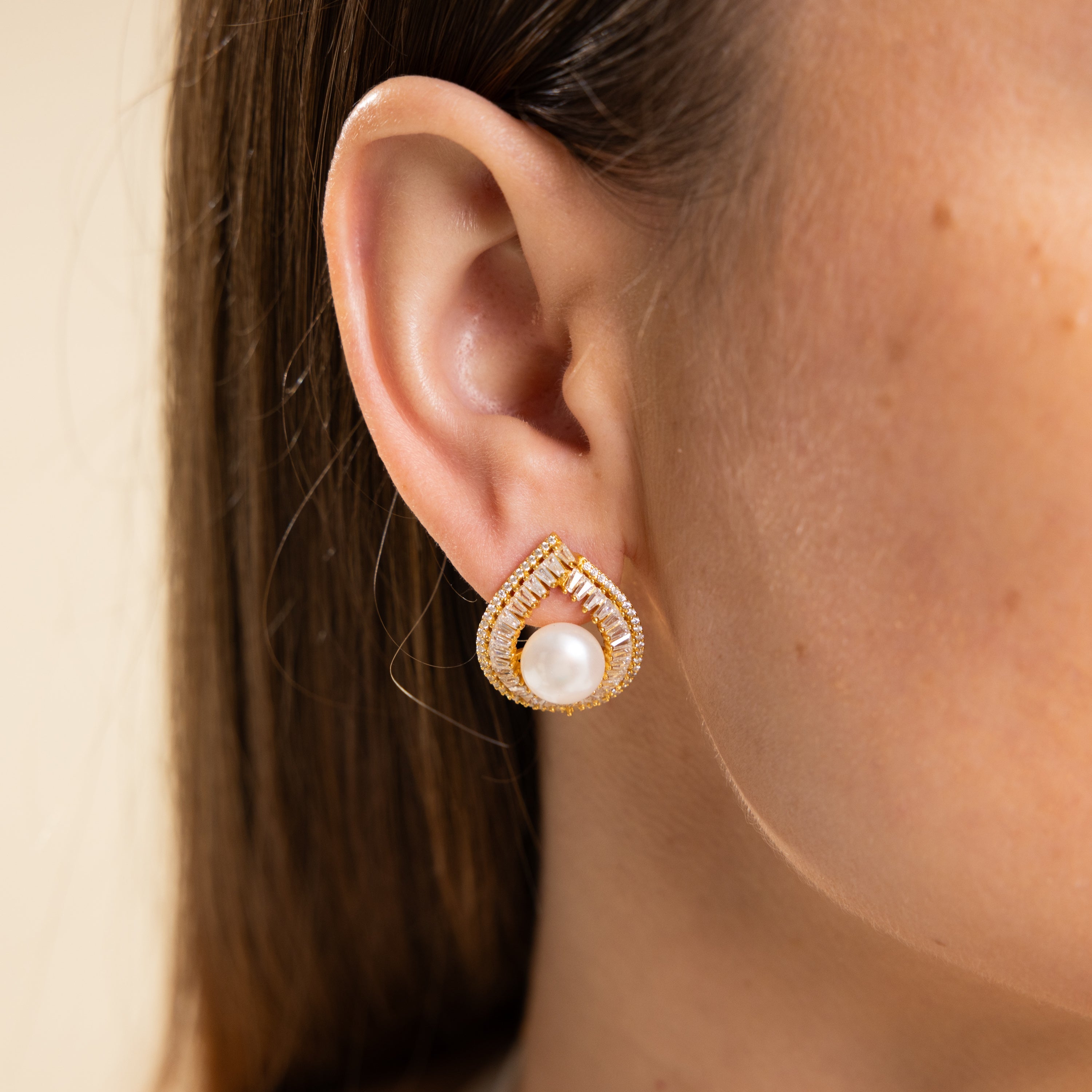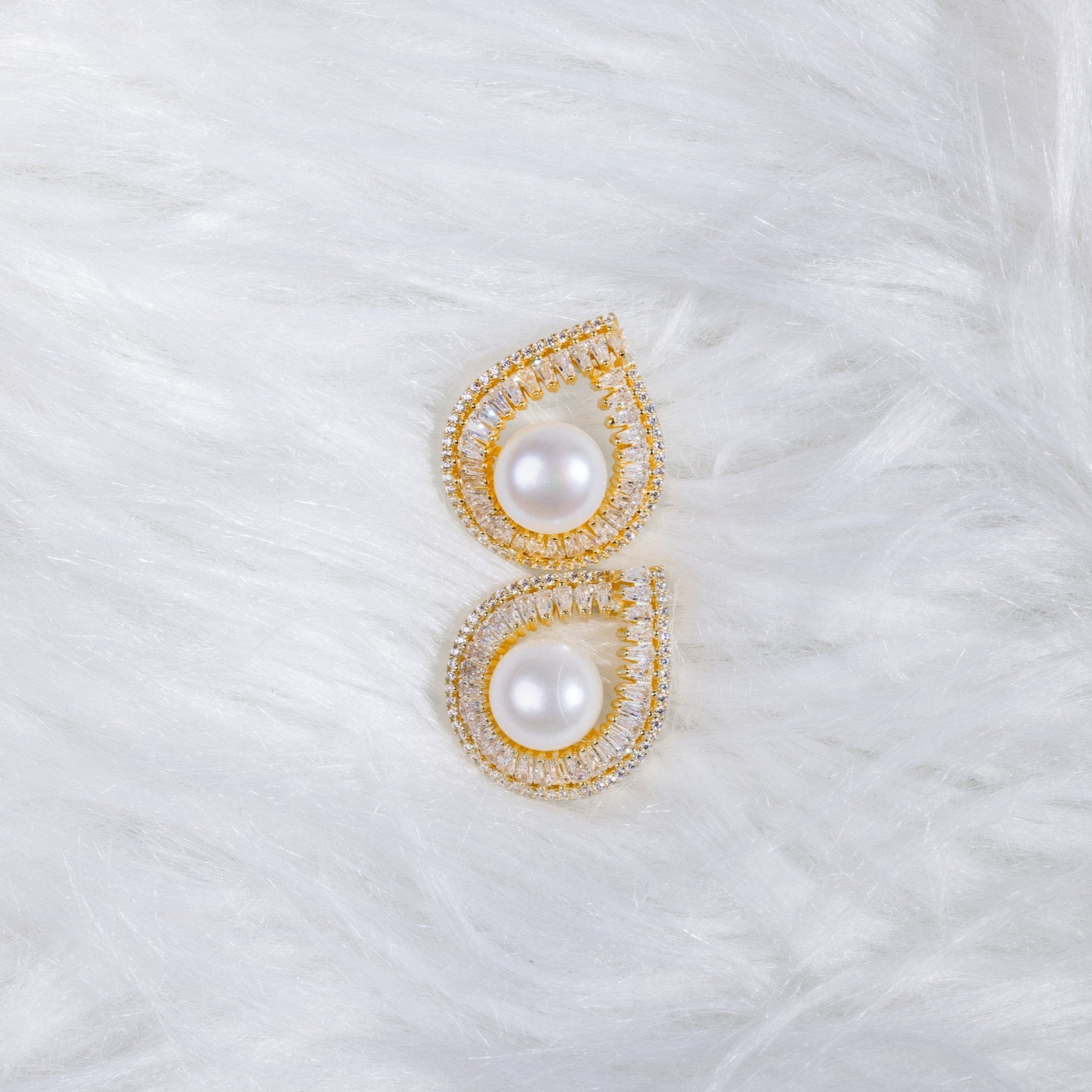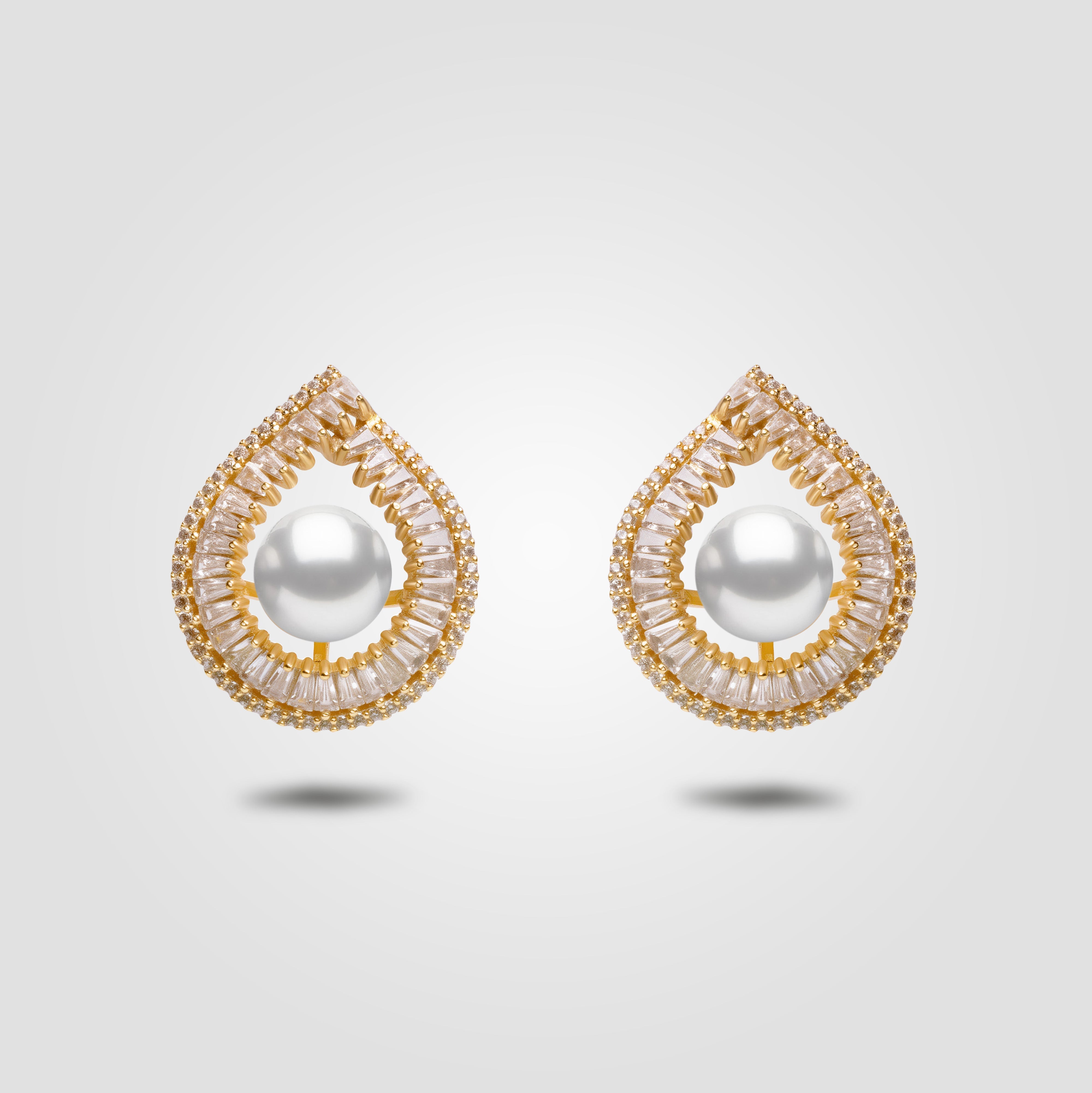 Radiating elegance in every curve, the Veléa Earrings embody the poetic grace of a teardrop captured in gold. At the heart of each piece rests a lustrous freshwater pearl, cradled in a halo of meticulously arranged baguette and pavé-set diamonds. The sweeping silhouette evokes both movement and stillness — like a frozen droplet of light.