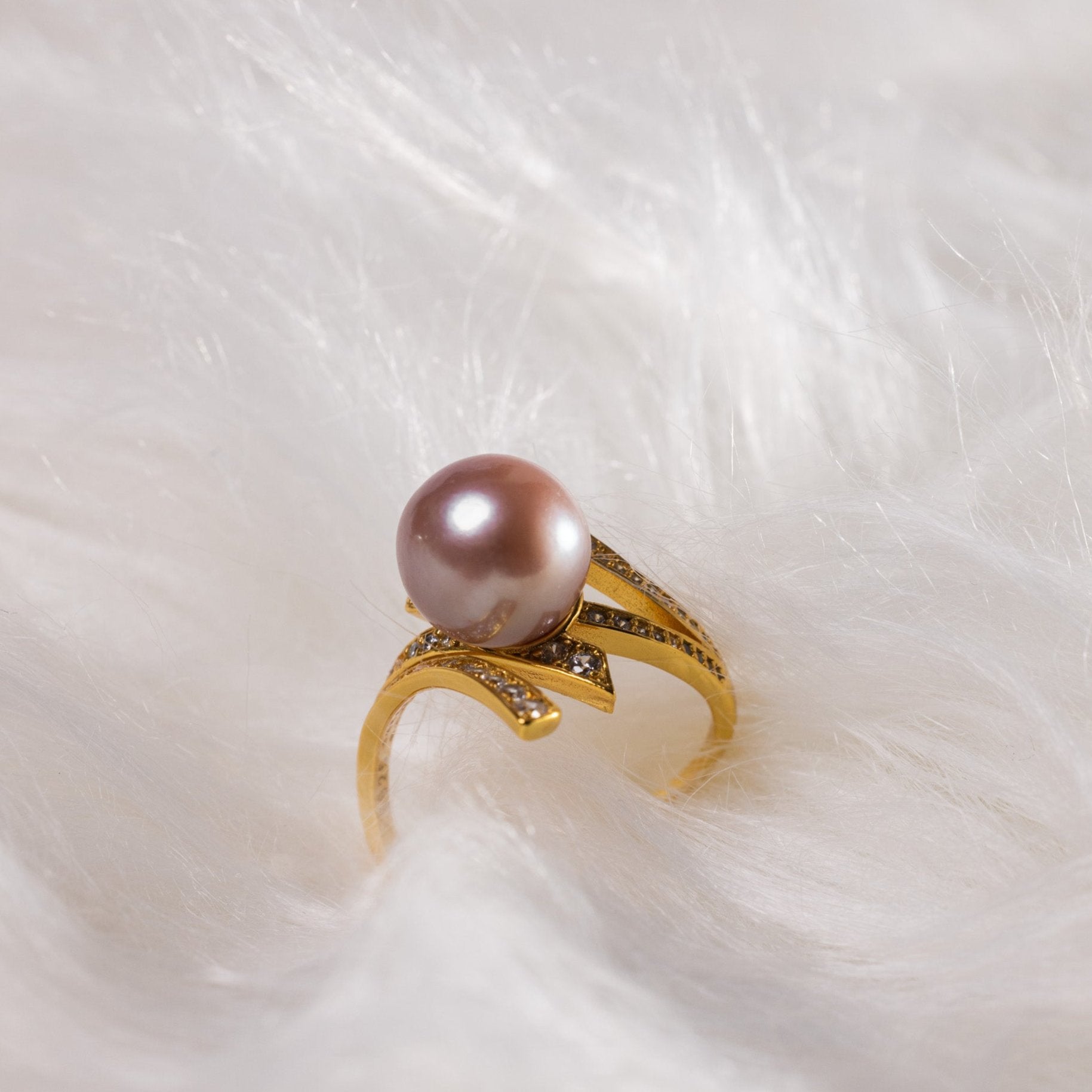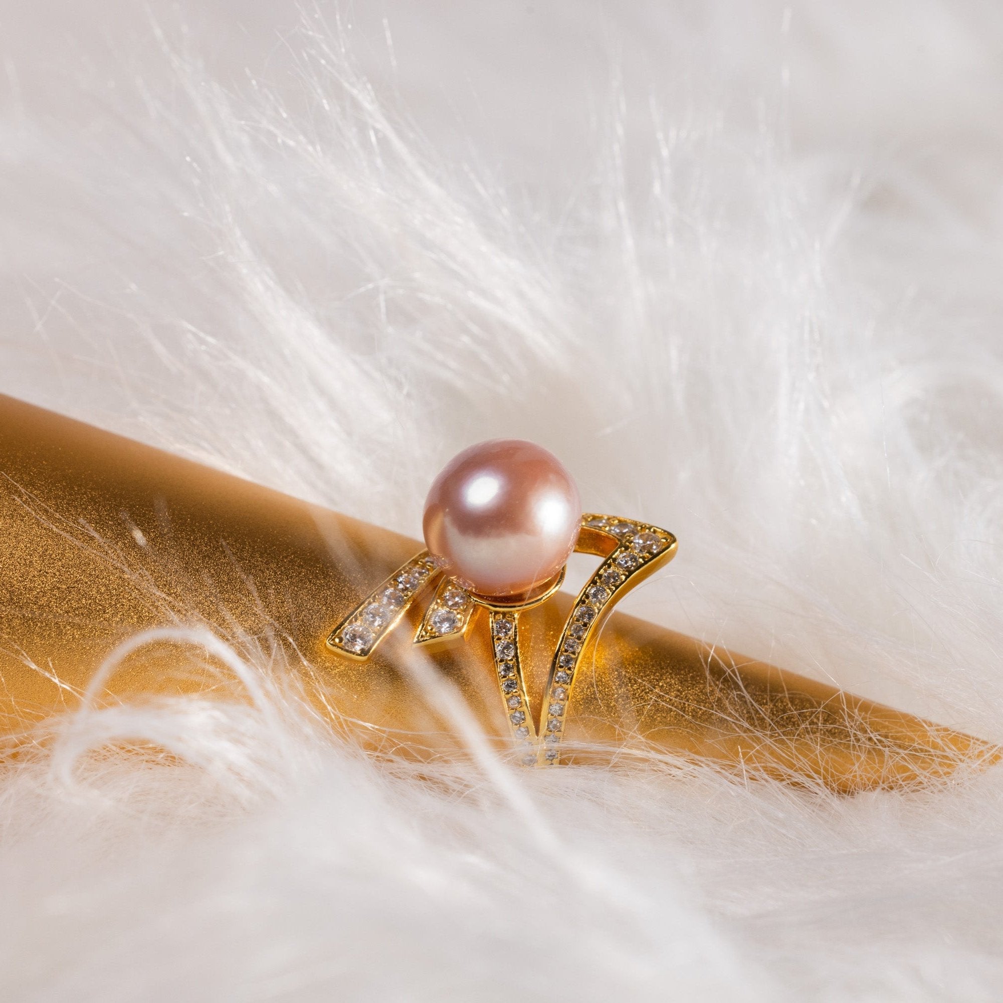 Radiating with celestial charm, the Aurasha Ring features a luminous 12.0mm peach freshwater pearl embraced by bold, architectural lines of 18K gold and pavé-set diamonds. The sculptural design evokes an aura of rising light, blending modern elegance with ethereal beauty.