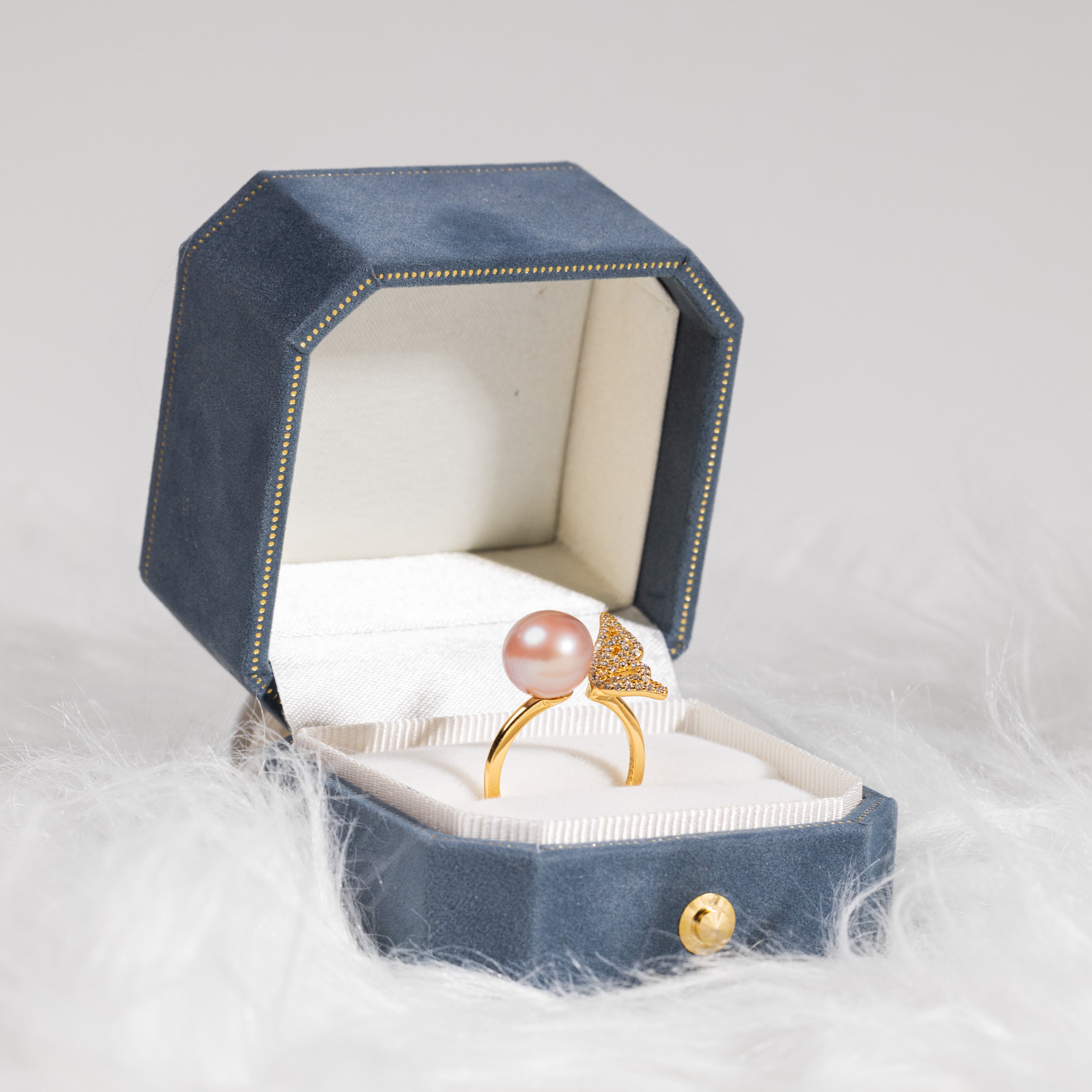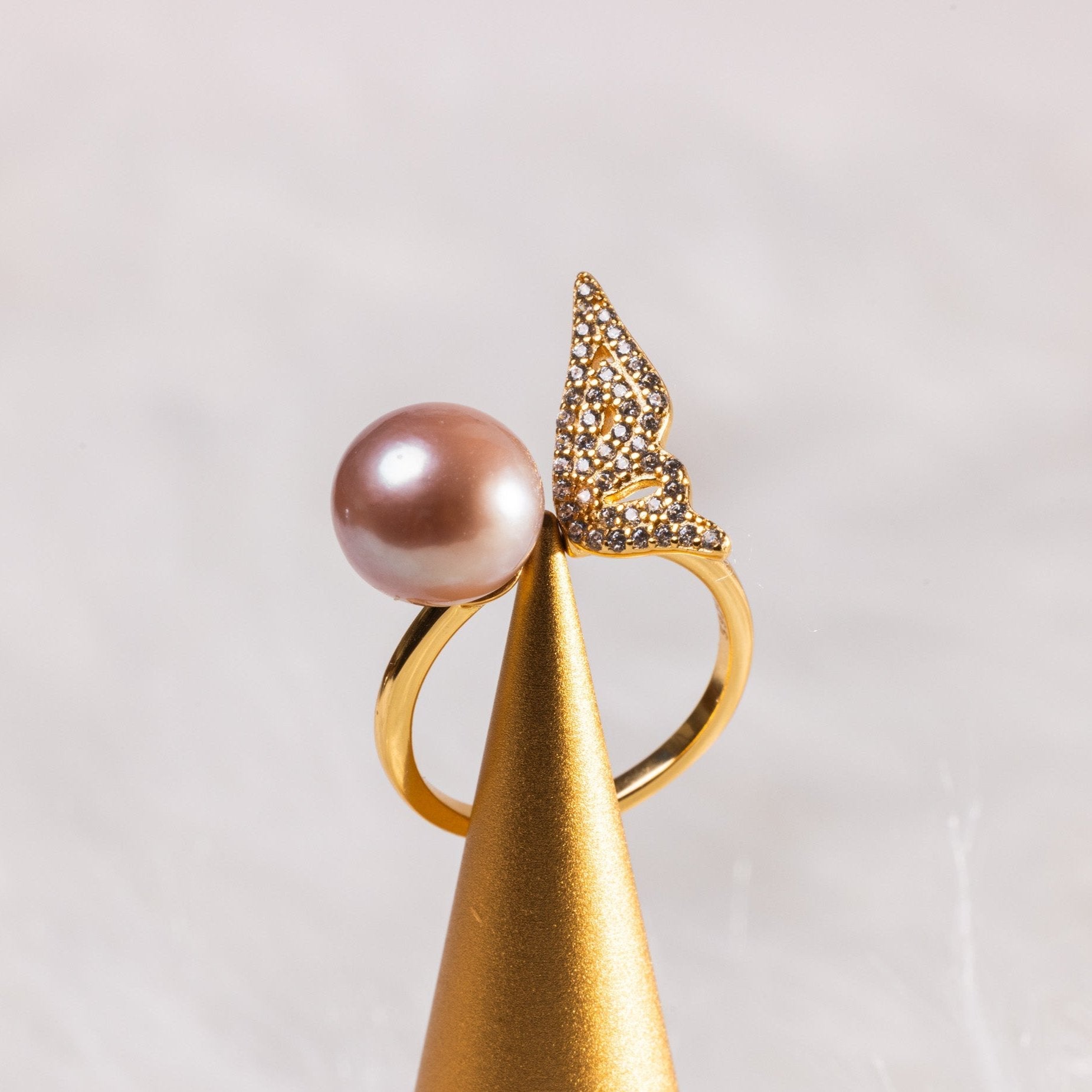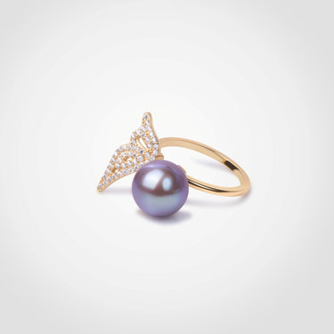 Graceful and enchanting, the Marivelle Ring features a luminous 12.0mm peach freshwater pearl embraced by a diamond-studded butterfly wing motif. The asymmetrical design evokes a sense of flight and transformation, capturing the spirit of freedom and elegance in every angle. Perfect for those who seek bold femininity with a touch of fantasy.