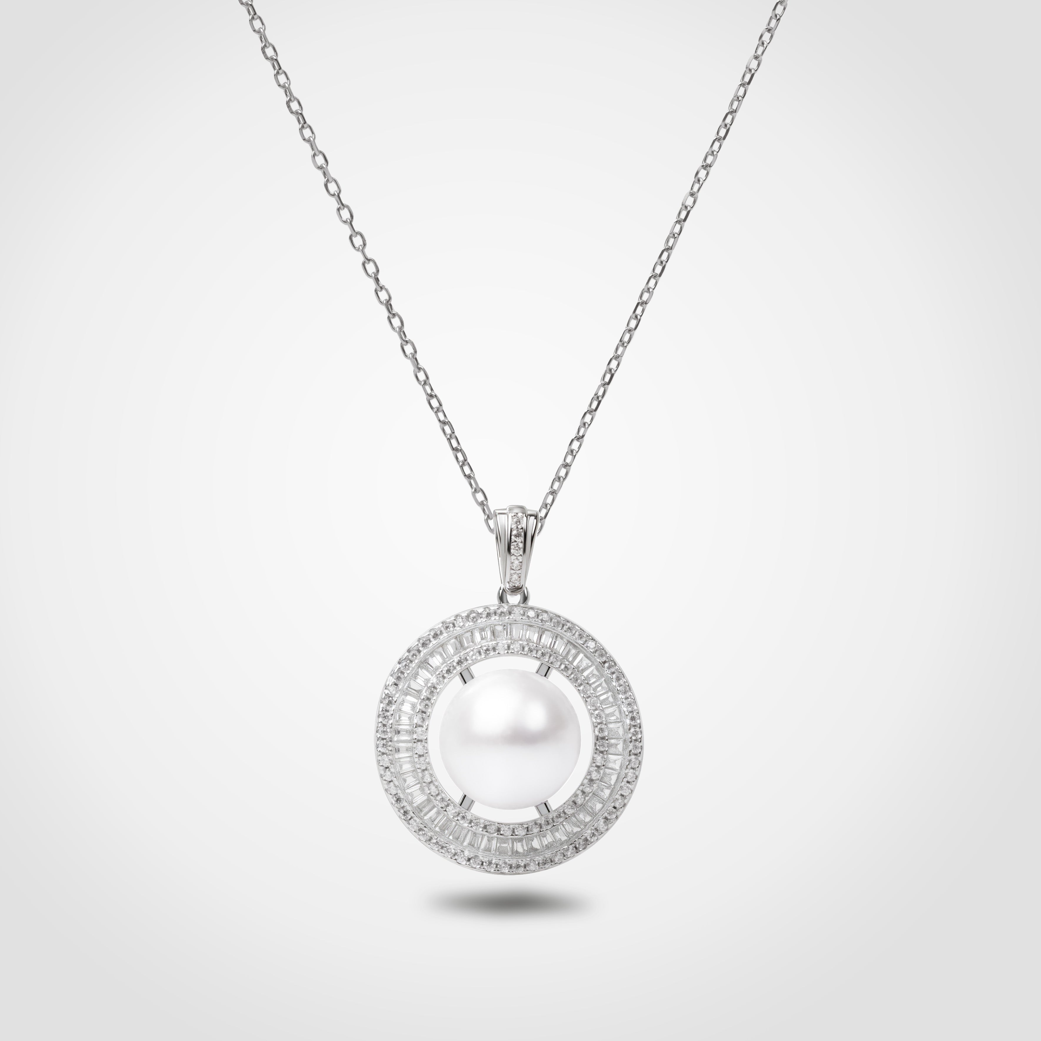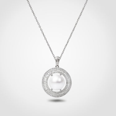A radiant embodiment of refinement, this pendant features a luminous white freshwater pearl encircled by a dazzling pavé-set halo. The round design evokes a celestial eclipse—timeless, serene, and powerful. Perfectly balanced in geometry and brilliance, this piece speaks to a woman of quiet strength and luminous elegance. Whether worn alone or layered, it is a statement of poise and prestige.