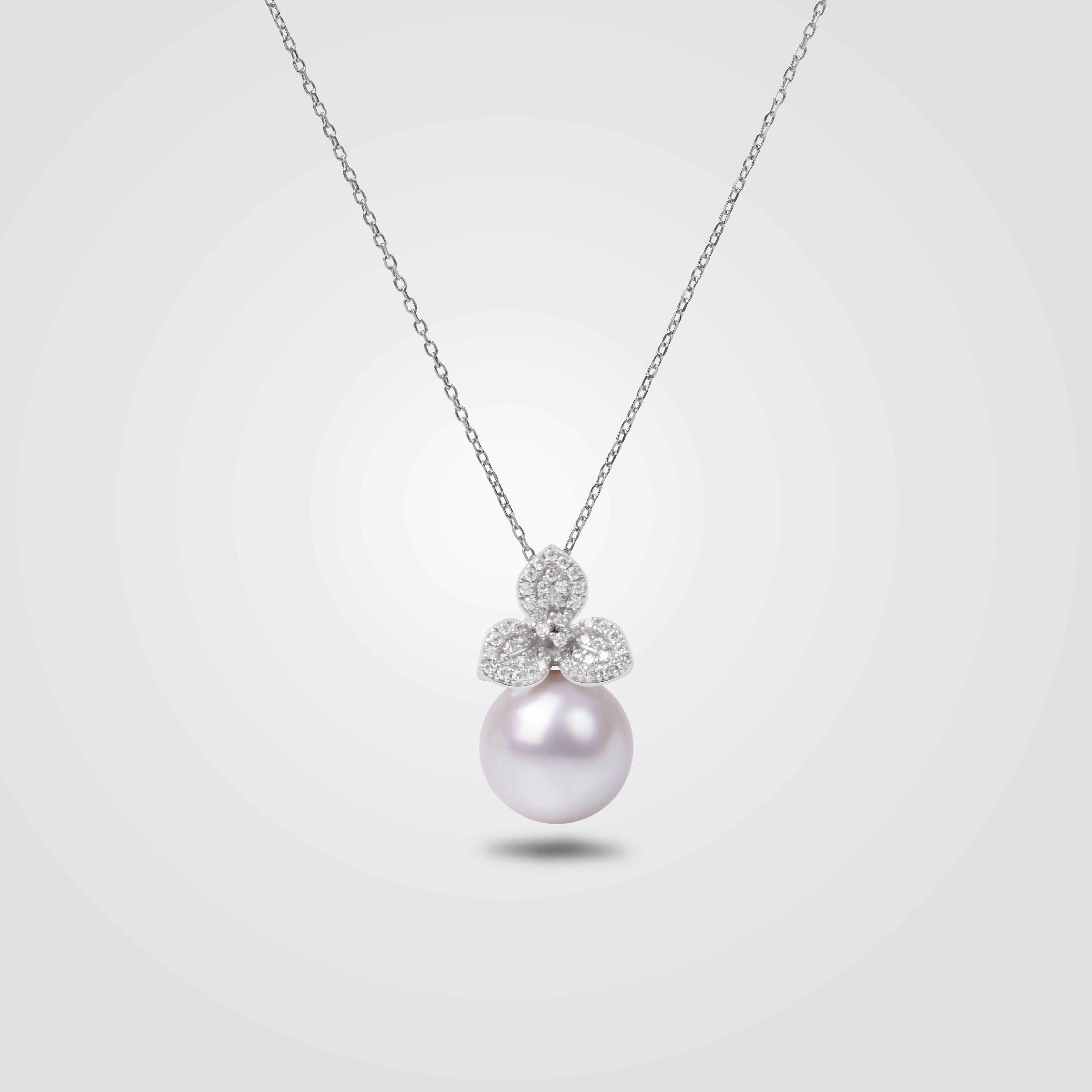 A vision of refined botanical grace, this pendant showcases a glowing White South Sea pearl, crowned by a trio of pavé-set petals shimmering with icy brilliance. The sculpted floral motif evokes the purity of a freshly bloomed orchid, while the rare pearl radiates with opulent luminosity. Perfectly poised between classic elegance and modern sophistication, this piece is a poetic tribute to nature’s most exquisite creations.