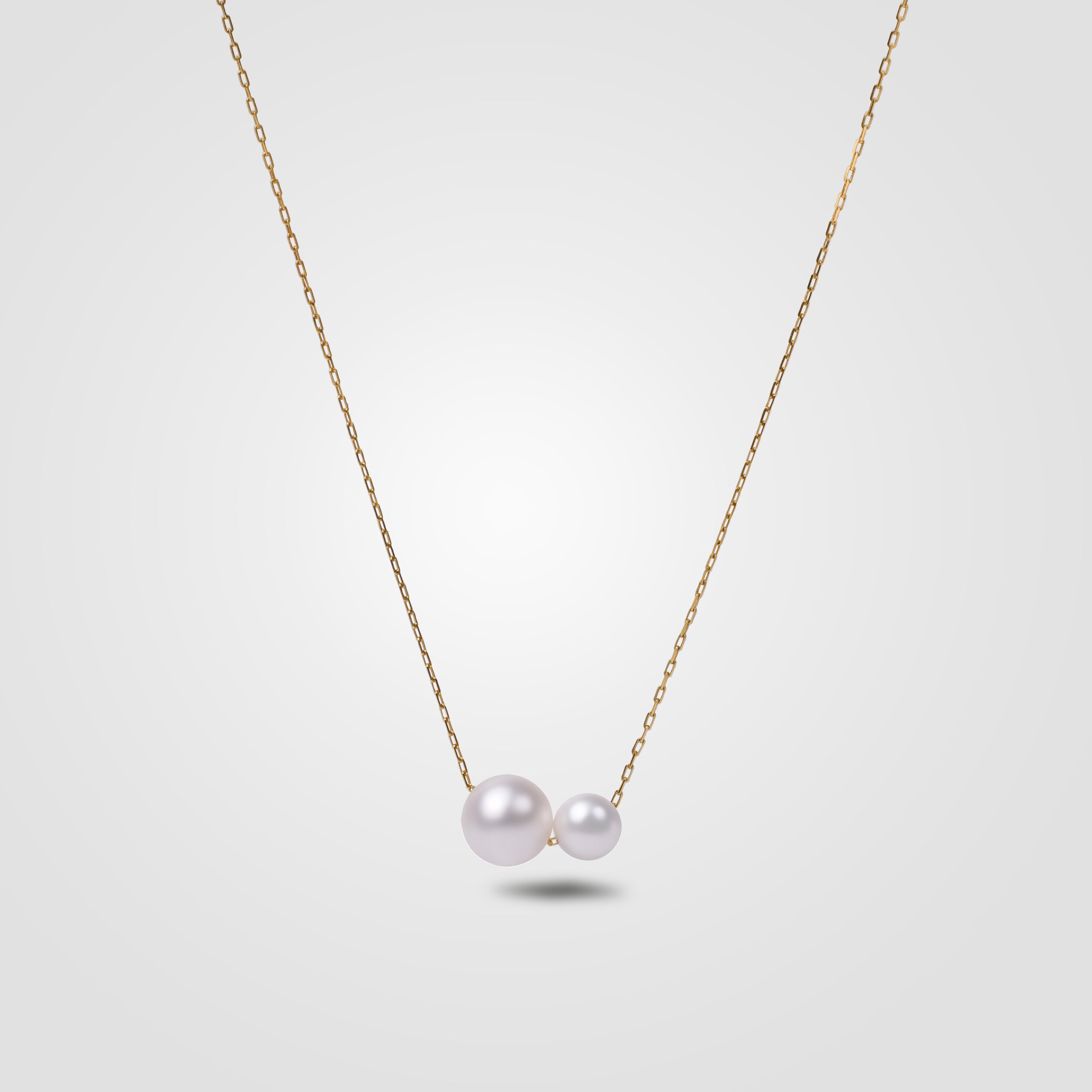 This pendant showcases a harmonious duet of white freshwater pearls — one larger, one smaller — suspended delicately on a chain. A tribute to balance, kinship, and understated luxury, it encapsulates the quiet power of refined design.