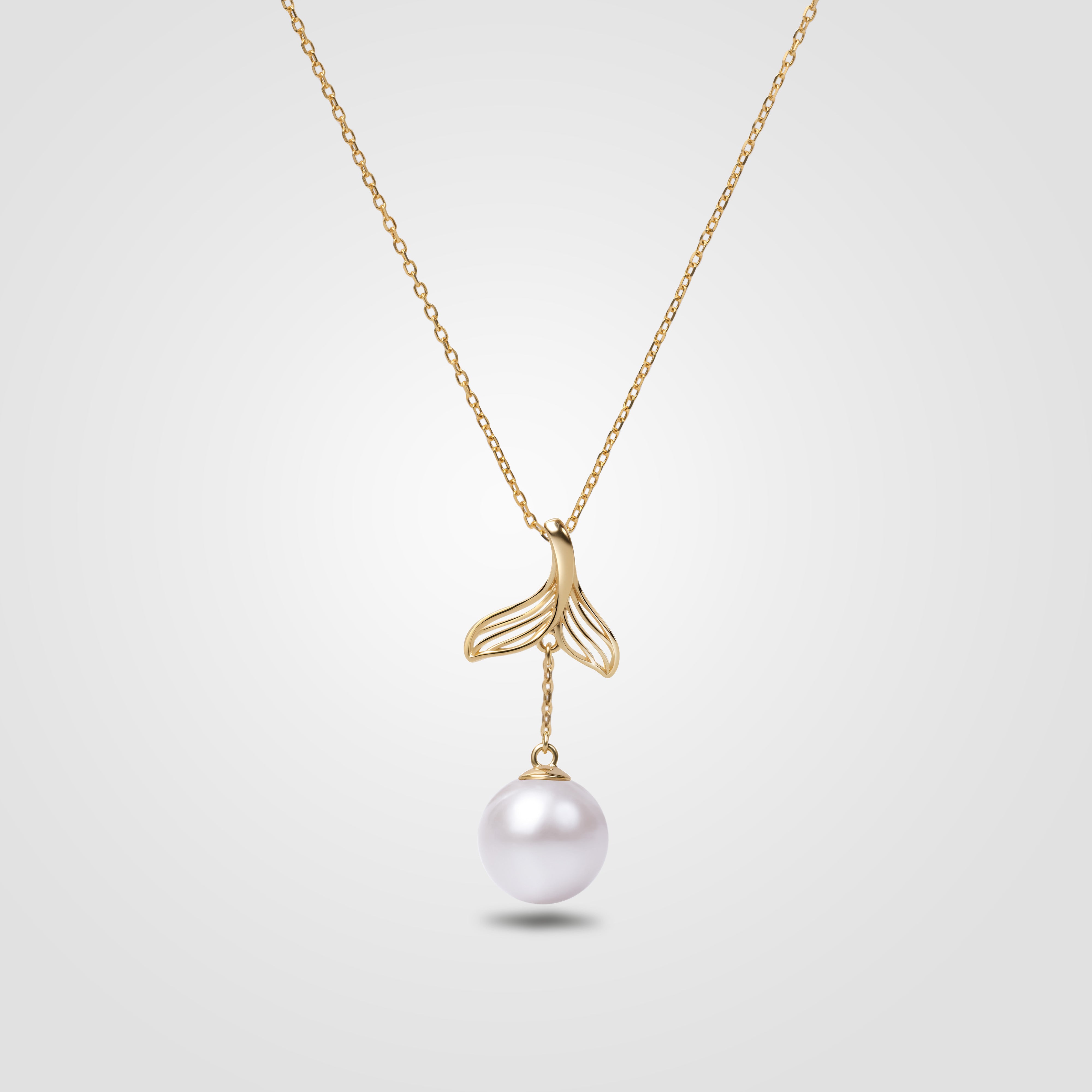 This exquisite pendant features a luminous white freshwater pearl suspended delicately from a sculpted mermaid tail. The flowing lines and satin-finished grooves of the tail evoke the fluidity of the sea, while the pearl—hand-selected for its mirror-like luster and flawless surface—glows with a moonlit iridescence.