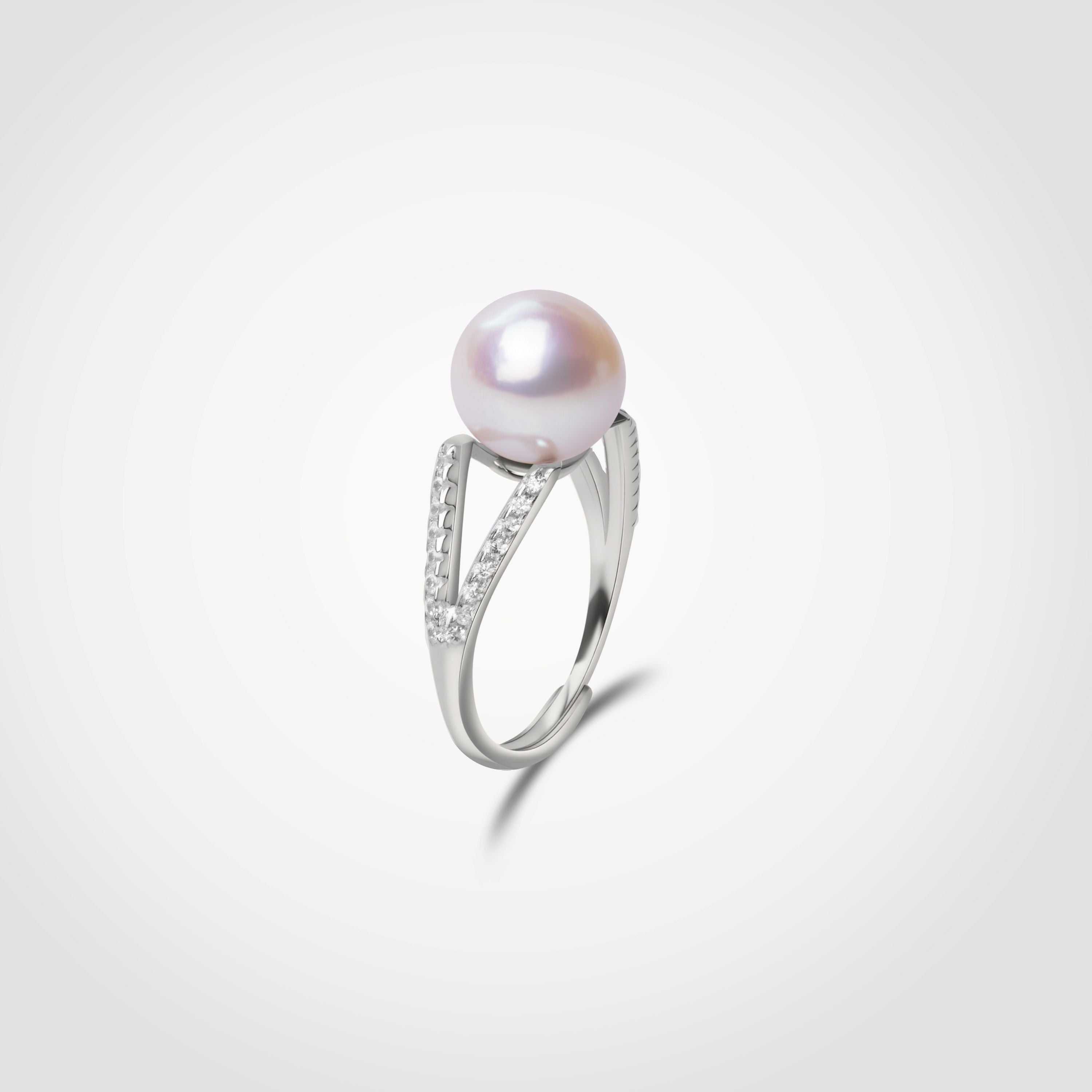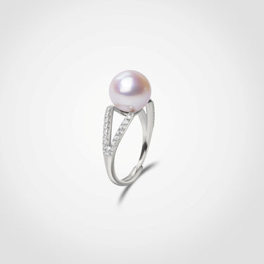 A sculptural tribute to purity and modern elegance, this statement ring features a luminous white freshwater pearl elevated on an open V-split band, encrusted with precision-set brilliant-cut gems. The dual-row design creates a sense of levitation and poise, reminiscent of a crown suspended in air.